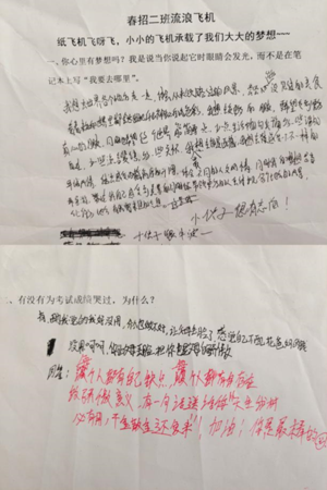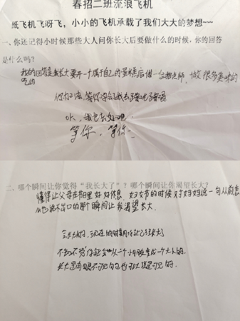 “流浪飞机”活动 组长随机发给小组同学一份小试卷,大家结合自身感受认真回答,问答全程匿名,填写好后开始你的问卷“流浪”,拿到问卷,你可以给楼主评论,也可以回答你对这个问题的想法。全班同学一起将手中的问卷折成自己所喜欢的纸飞机模样,让它带着你的梦想或烦恼一起飞向教室半空中。飞机自由放飞后同学们捡起离自己最近的飞机,展开、阅读作者的故事并给予留言回应(请同学们尊重每一位作者的表达欲,不讨论、不开玩笑和不写负面贬义词语,一定要认真对待!)回复完放飞,一共放飞三次,每个故事可以得到三次留言。