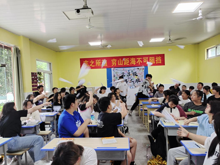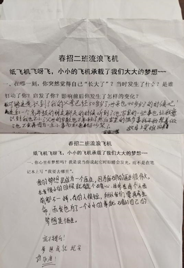 流浪纸飞机——23级春招2班开展心理健康主题活动发表时间:2023-06-02 16:02 流浪纸飞机——23级春招2班开展心理健康主题活动5月30日,2023级春招2班开展“流浪纸飞机”主题活动,时光回溯带领学生回顾自己的青春时光,接着全程匿名书写几个问题“班上有没有你特别佩服的人?为什么?”“你心里有梦想吗?我是说当你说起它时眼睛会发光,而不是在笔记本上写我要去哪里?”“你想成为一个怎样的人?”“你还记得小时候那些大人问你长大后要做什么的时候,你的回答是什么吗?”“最近有没有什么让你困扰的事?可以说出来让大家帮忙解决”“你觉得你是父母的骄傲吗?最近有没有为父母做过什么?”等问题,写好后折成纸飞机飞向同学,以同伴力量实现互助。收到他人温暖回复的同学露出笑脸,感受到鼓励的力量和来自伙伴的支持。